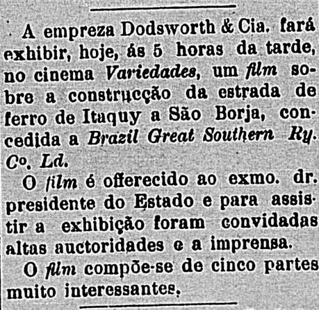 A empresa Dodsworth & Cia. fará exibir, hoje, às 5 horas da tarde, no cinema Variedades, um filme sobre a construção da estrada de ferro de Itaquy a São Borja, concedida a Brazil Great Southern Ry. Co. Ld.