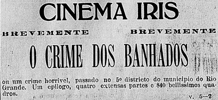 Com boa assistência, foi, ontem, exibida sobre a tela daquele centro de diversões a fita de atualidade – O Crime dos Banhados, que, como é sabido de todos se passou nas proximidades da cidade do Rio Grande.